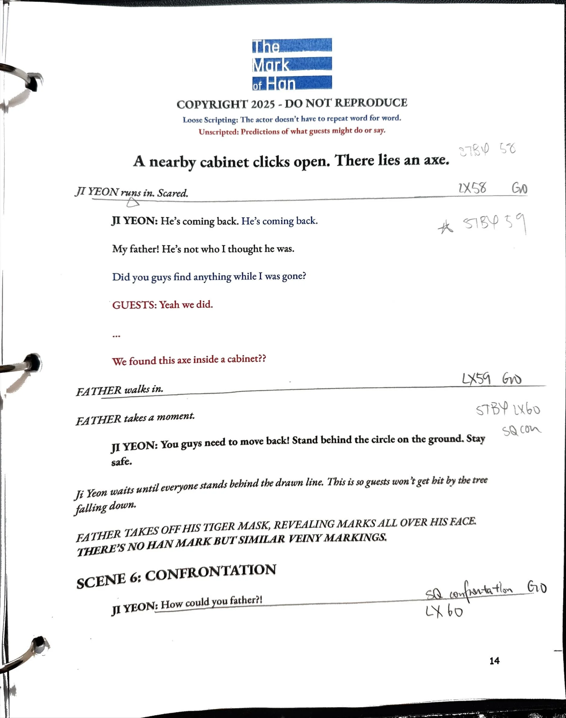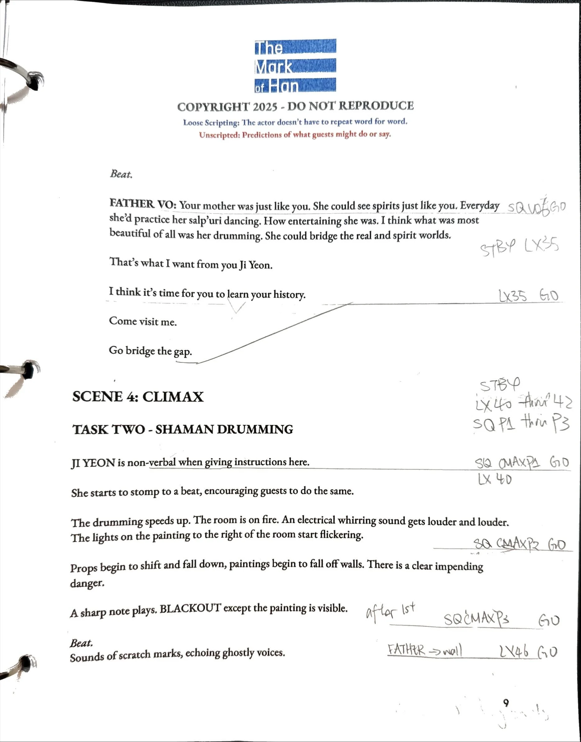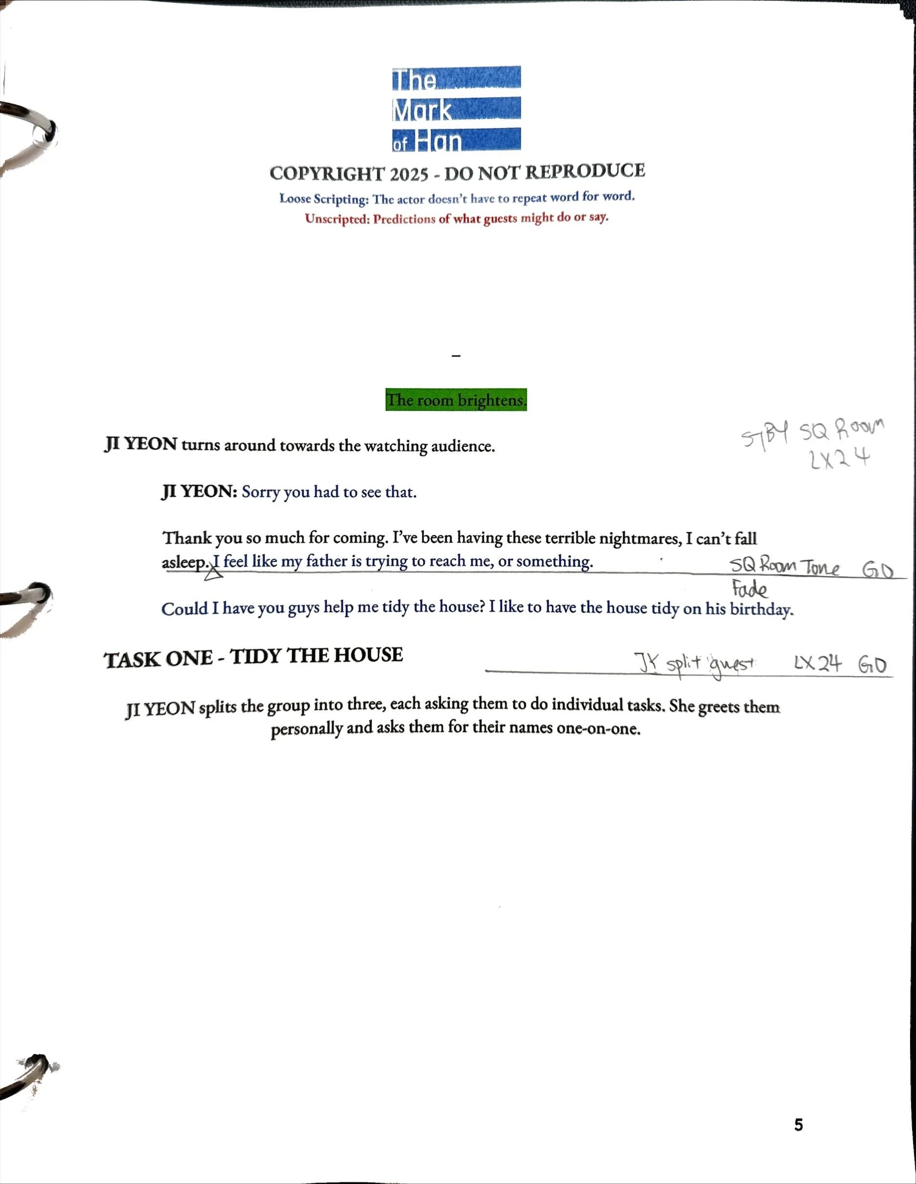 This is an immersive play that revolves around the history of the Korean War, comfort women, and traumas from those historical periods. Though this is only a 30-minute immersive experience, this production involves a ton of dynamic elements, including guests moving in between three different rooms, a falling tree, fog, and more.